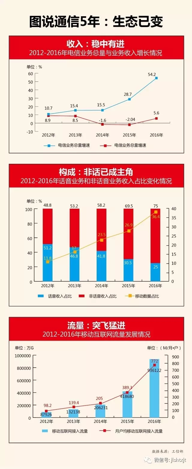 过去五年,电信业务收入总体稳中有进,收入结构已由语音、短信业务逐步向互联网接入和移动流量业务倾斜,非语音收入呈逐年大幅增长态势。