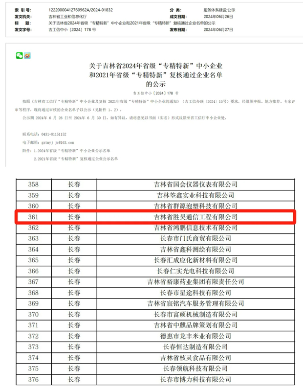 胜昊通信工程获批吉林省2024年“专精特新”中小企业