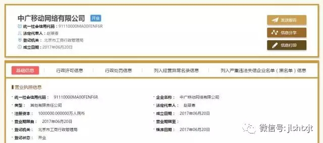 这一点也可从从公布的工商信息得到确认。注册信息显示,中广移动所属行业为电信、广播电视卫星传输服务。