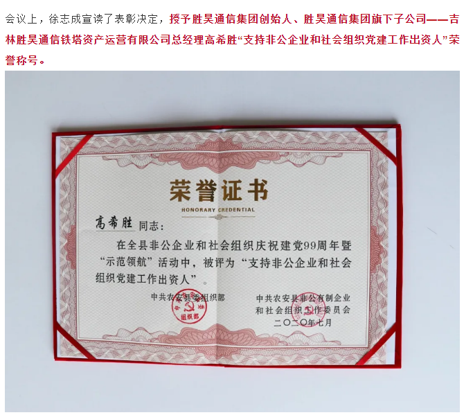 胜昊通信集团创始人高希胜荣获“支持非公企业和社会组织党建工作出资人”荣誉称号