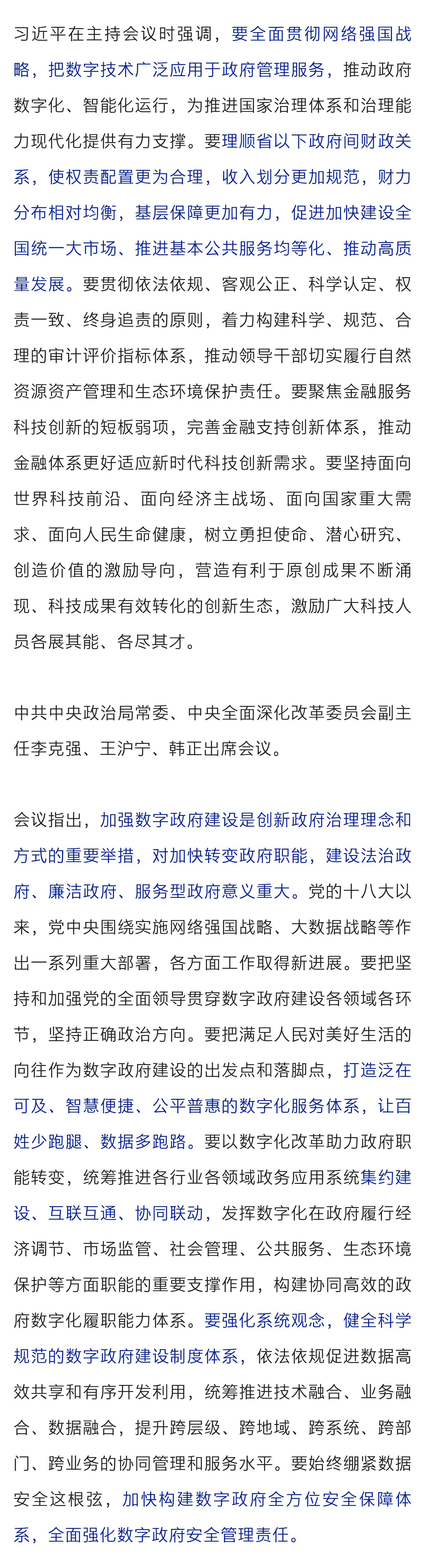 习近平召开中央深改委会议强调 加强数字政府建设 推进省以下财政体制改革