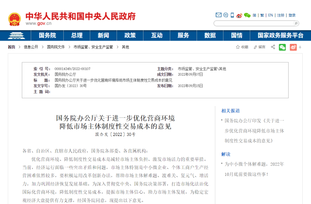 【中国政府网9月15日消息】国务院办公厅发布《关于进一步优化营商环境降低市场主体制度性交易成本的意见》。